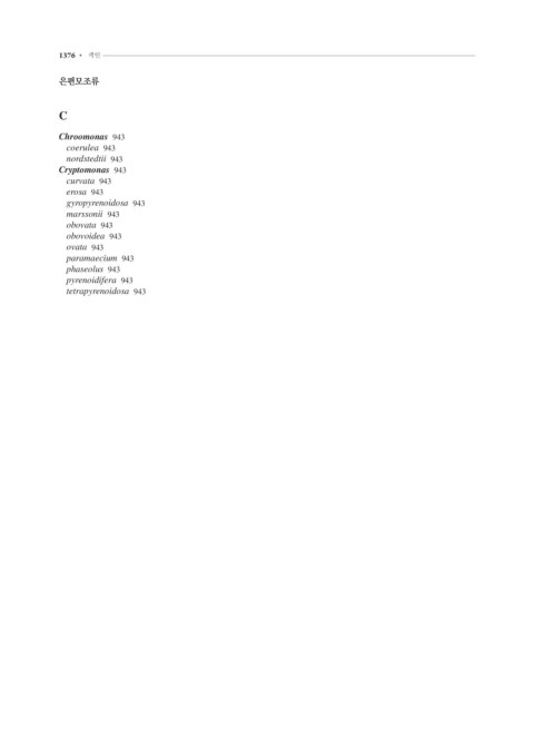 1376 • 색인 은편모조류 C Chroomonas 943 coerulea 943 nordstedtii 943 Cryptomonas 943 curvata 943 erosa 943 gyropyrenoidosa 943 marssonii 943 obovata 943 obovoidea 943 ovata 943 paramaecium 943 phaseolus 943 pyrenoidifera 943 tetrapyrenoidosa 943