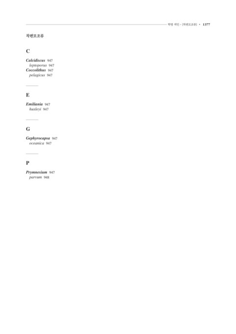 1376 • 색인 학명 색인 - [착편모조류] • 1377 착편모조류 C Calcidiscus 947 leptoporus 947 Coccolithus 947 pelagicus 947 E Emiliania 947 huxleyi 947 G Gephyrocapsa 947 oceanica 947 P Prymnesium 947 parvum 948