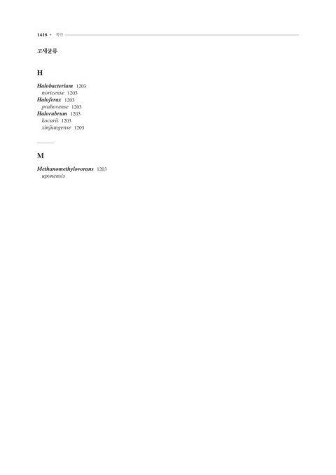 1418 • 색인 고세균류 H Halobacterium 1203 noricense 1203 Haloferax 1203 prahovense 1203 Halorubrum 1203 kocurii 1203 xinjiangense 1203 M Methanomethylovorans 1203 uponensis